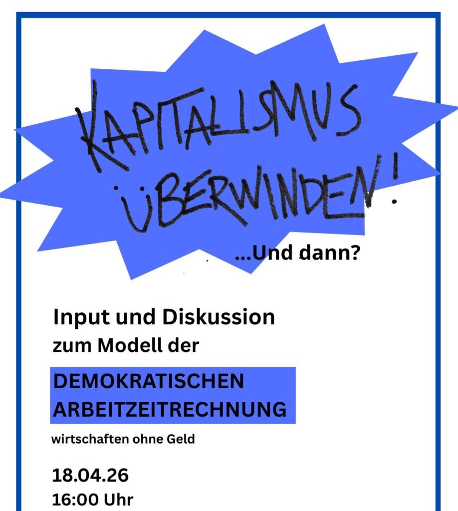 Damit wollen wir uns beschäftigen, um Perspektiven und Transformationswege zu überlegen. Basierend auf den Gesprächen und Diskussionen unserer letzten beiden Treffen schauen wir uns die demokratische Arbeitszeitrechnung genauer an. Also gibt es einen kleinen Input dazu, und dann im Anschluss gemeinsames Grübeln und Diskussion, rund um das Thema: Wie können wir ohne Geld, ohne Ausbeutung und selbstorganisierte Wirtschaftsformen finden?